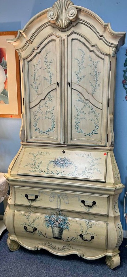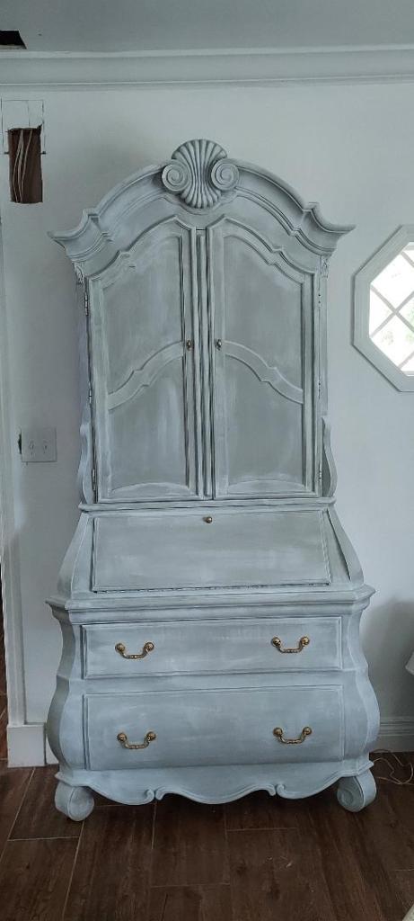 i love the shape and detail, but the paint was not for me so i gave it a swedish makeover. I layered different shades of grey and white and sprayed the hardware gold and just LOVE the way it came out!