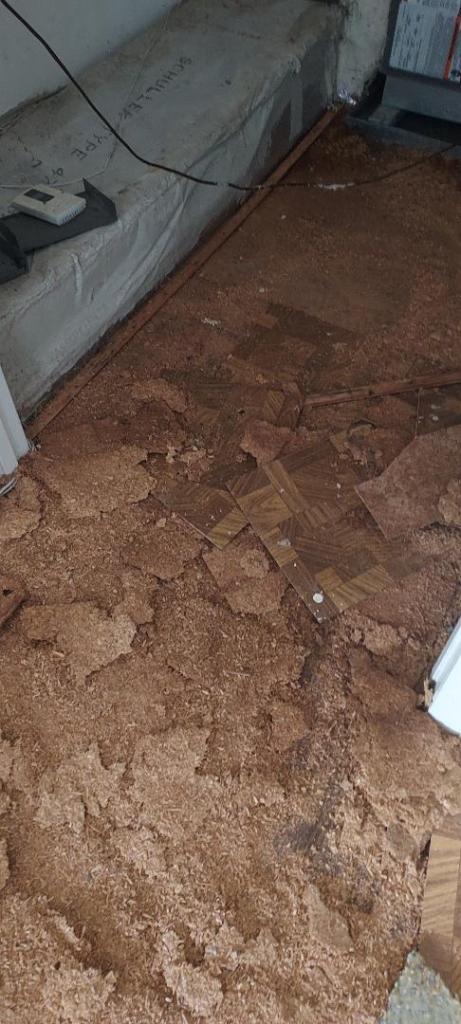 Installation day was supposed to be last week but when the men started to pull up an old layer of linoleum, they discovered the original sub floor was particle board and had turned into powder.