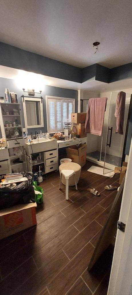 As we speak, I have the floor crew back upstairs for the installation. a rep from the company just came over to measure the big room over the garage which will probably be the man cave. As i got to the top step, i realized i was standing on soaking wet carpet. It turns out there is a leak in a bar sink and the refrigerator had shut off and defrosted. The poor guy ended up helping me pull up the carpet and shutting off the water.