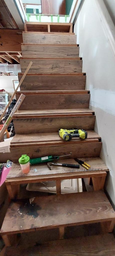I had extra flooring planks so I purchased an electric Brad nailer gun to attach them to the steps. It is the best tool ever! No hammering and cord free.