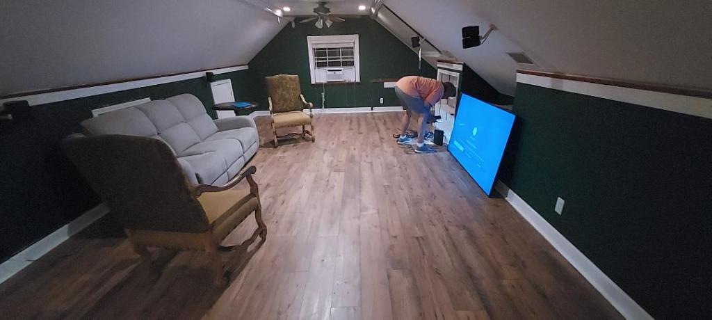 the Man Cave got a new floor and some new furniture. We ripped out some very dated audio visual components and had a massive flood from a pipe but ripped it all out and replaced with wood plank floor.