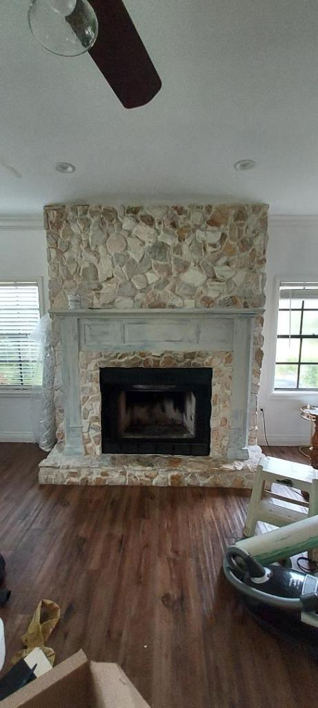 this photo is from the original house listing, showing the fireplace painted black. I painted it off white and also Lightly brushed the stone to hide the bright orange and brown tones.