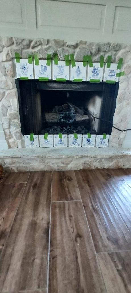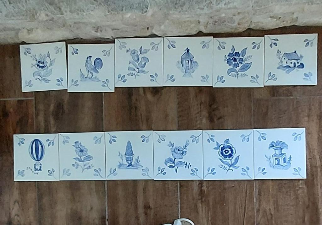The metal frame of the box was black and very dark so to lighten it up i searched for 6″ tiles to fill in the top and bottom. I found exactly what i wanted on etsy, 12 hand painted delft style blue with charming flowers and farm animals.