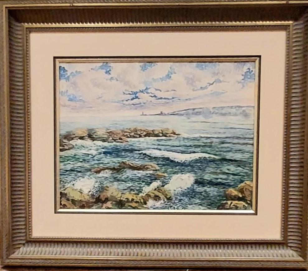 My grandparents had given me a beautiful original watercolor by the american artist arthur weindorf. he was a friend and associate of my grandfather, who was the lead architect for the city of new york under mayor john lindsay. I actually have several of his paintings but this one is very special as it reminds me of a Monet. It is thousands of tiny brushstrokes in many shades of blues and greens.