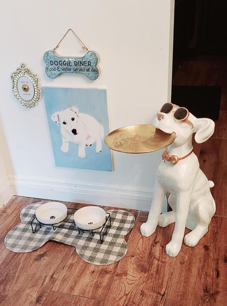 and speaking of buddy, he now has his very own custom eating area complete with a portrait of him painted by my daughter, a champagne call button and a look alike butler!