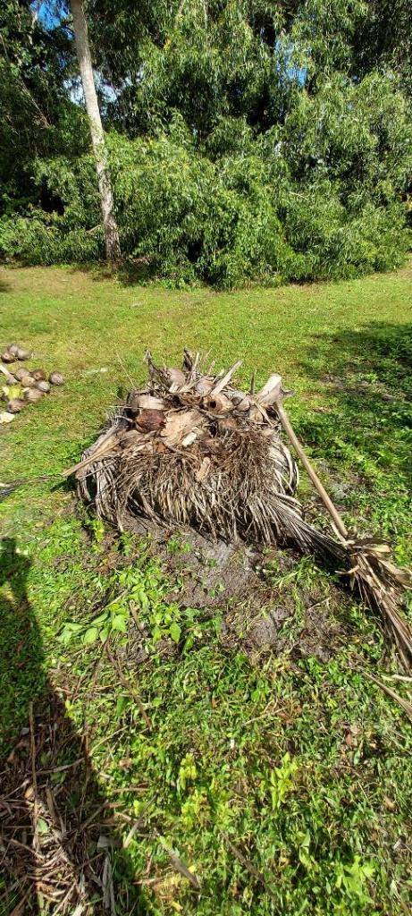 and in front of that was a big pile of brown coconuts and palm leaves.