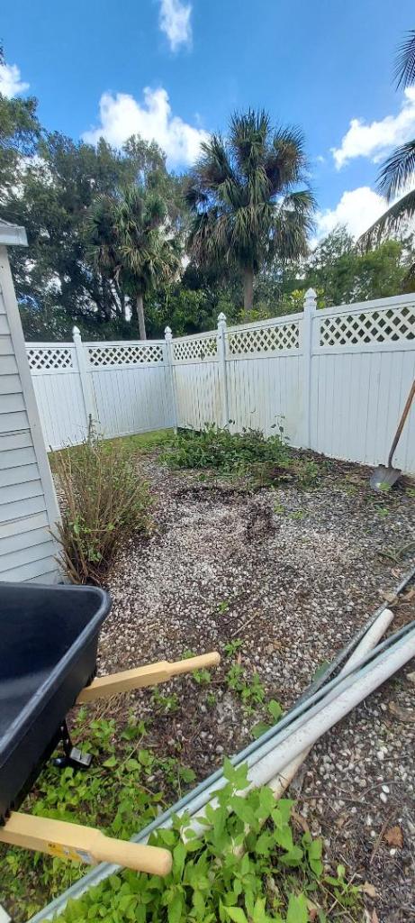 behind the shed is a big area that was very overgrown with weeds. I thought maybe it was a garden, but after pulling everything out, it turned out to be just a 2 foot deep gravel pit.